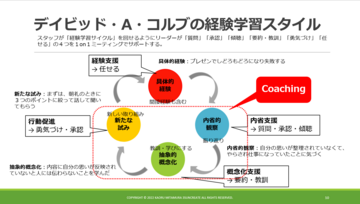 米国の教育理論家であるデイビッド・A・コルブが提唱した学習方法の『経験学習サイクル』をつかって、スタッフが①経験→②内省→③学び→④新しい試み→①経験~、「経験学習サイクル」をスタッフ自らが回せるように1on1ミーティングでサポートしていきます。