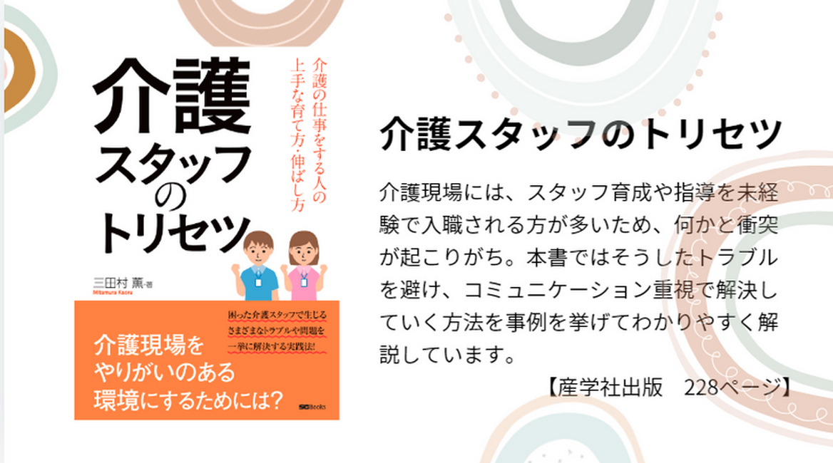 本書タイトルの『介護スタッフのトリセツ』とは、少し乱暴な表現ですが『介護スタッフの取扱説明書』という意味です。